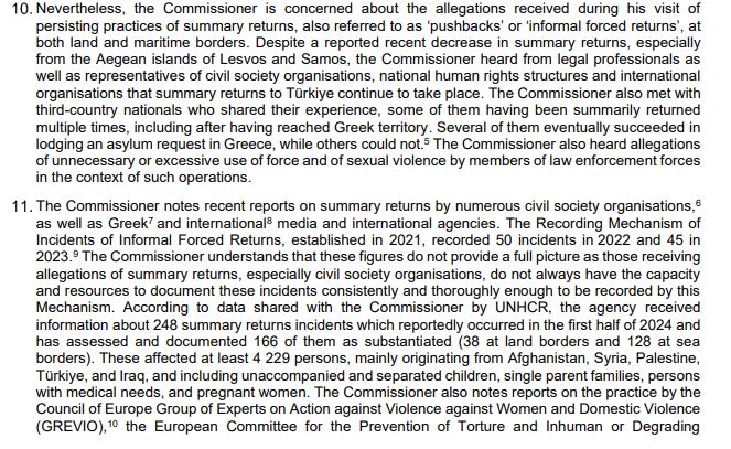 Συγκεκριμένα στο υπόμνημα αναφέρεται: «Παρά τις πρόσφατες αναφορές για μείωση των επαναπροωθήσεων, κυρίως από τα νησιά του Αιγαίου, τη Λέσβο και τη Σάμο, ο Επίτροπος άκουσε από νομικούς καθώς και από εκπροσώπους οργανώσεων της κοινωνίας των πολιτών, εθνικών μηχανισμών ανθρωπίνων δικαιωμάτων και διεθνών οργανισμών, ότι οι αναγκαστικές επιστροφές στην Τουρκία συνεχίζονται. Ο Επίτροπος συνάντησε επίσης υπηκόους τρίτων χωρών που μοιράστηκαν την εμπειρία τους. Μερικοί από αυτούς είχαν επιστραφεί αναγκαστικά πολλές φορές, ακόμη και μετά την άφιξή τους σε ελληνικό έδαφος. Ορισμένοι από αυτούς κατάφεραν τελικά να καταθέσουν αίτηση ασύλου στην Ελλάδα, ενώ άλλοι όχι. Ο Επίτροπος άκουσε επίσης καταγγελίες για αχρείαστη ή υπερβολική χρήση βίας και για σεξουαλική βία από μέλη των δυνάμεων επιβολής του νόμου στο πλαίσιο αυτών των επιχειρήσεων.