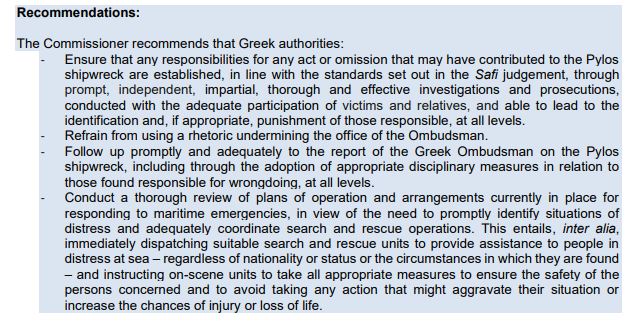 - Να διασφαλίσουν ότι θα αποδοθούν ευθύνες για οποιαδήποτε πράξη ή παράλειψη που ενδέχεται να συνέβαλε στο ναυάγιο της Πύλου, σύμφωνα με τα πρότυπα που καθορίζονται στην απόφαση Safi, μέσω άμεσων, ανεξάρτητων, αμερόληπτων, εις βάθος και αποτελεσματικών ερευνών και διώξεων, με επαρκή συμμετοχή των θυμάτων και των συγγενών τους, οι οποίες θα είναι ικανές να οδηγήσουν στην αναγνώριση και, εφόσον ενδείκνυται, στην τιμωρία των υπευθύνων σε όλα τα επίπεδα.