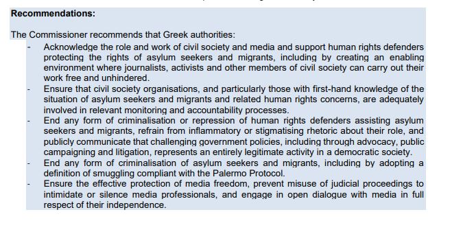 «Οι υπερασπιστές των ανθρωπίνων δικαιωμάτων που προωθούν και προστατεύουν τα δικαιώματα μεταναστών, αιτούντων άσυλο και προσφύγων – συμπεριλαμβανομένων δικηγόρων, ανθρωπιστικών εργαζομένων, εθελοντών και δημοσιογράφων – έχουν υποστεί δυσφημιστικές εκστρατείες, μεταβαλλόμενο ρυθμιστικό περιβάλλον, απειλές και επιθέσεις, καθώς και κατάχρηση του ποινικού δικαίου σε βαθμό σοκαριστικό».