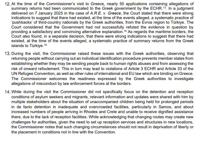 Στο υπόμνημα αναφέρει ότι η Ελλάδα «έχει δεχθεί ιδιαίτερα μεγάλη πίεση από αφίξεις μεταναστών χωρίς νόμιμα έγγραφα, περιλαμβανομένων αιτούντων άσυλο», με τον Επίτροπό να σημειώνει ότι «αναγνωρίζει τη δυσκολία του επιχειρησιακού περιβάλλοντος που αντιμετωπίζουν οι αρχές ασφαλείας στα χερσαία και θαλάσσια σύνορα», εκφράζοντας ωστόσο έντονη ανησυχία για «τις επίμονες αναφορές σχετικά με τη συνεχιζόμενη πρακτική των επαναπροωθήσεων, τόσο στη στεριά όσο και στη θάλασσα».