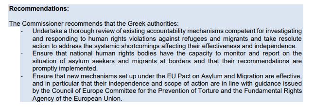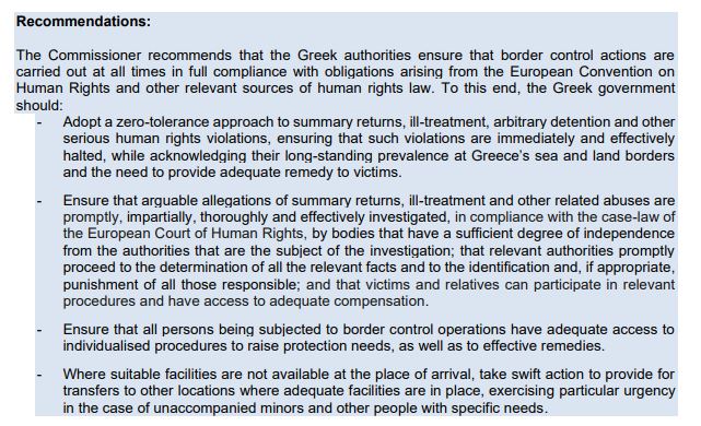 Ο Επίτροπος καλεί τις ελληνικές αρχές να διασφαλίσουν ότι οι ενέργειες ελέγχου των συνόρων πραγματοποιούνται πάντοτε με πλήρη συμμόρφωση με τις υποχρεώσεις που απορρέουν από τη Ευρωπαϊκή Σύμβαση Ανθρωπίνων Δικαιωμάτων και άλλες σχετικές πηγές δικαίου για τα ανθρώπινα δικαιώματα. Για το σκοπό αυτό, η ελληνική κυβέρνηση θα πρέπει να: