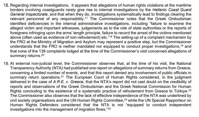 Όπως παρατηρεί ωστόσο ο Επίτροπος, όσον αφορά τις εσωτερικές έρευνες, φαίνεται ότι οι καταγγελίες για παραβιάσεις ανθρωπίνων δικαιωμάτων στα θαλάσσια σύνορα που αφορούν το λιμενικό σπάνια οδηγούν σε εσωτερικές έρευνες από τη Γενική Επιθεώρηση του Λιμενικού Σώματος, και όταν συμβαίνει αυτό, οι έρευνες οδηγούν συστηματικά σε συμπεράσματα που απαλλάσσουν το προσωπικό από οποιαδήποτε ευθύνη. Ο Επίτροπος σημειώνει ότι ο Συνήγορος του Πολίτη εντόπισε ελλείψεις στις εσωτερικές διοικητικές έρευνες, όπως η «αποτυχία εξέτασης του φερόμενου θύματος και σημαντικών μαρτύρων, οι κρίσεις σχετικά με τον ρόλο των κρατικών αρχών ή οι αναφορές αλλοδαπών που παραβιάζουν την αρχή της απόστασης, η αποτυχία καταγραφής της σύλληψης των θυμάτων (που συχνά χρησιμοποιούνται ως απόδειξη της απαγόρευσης επαναπροώθησης) κλπ.» Η ίδρυση ενός μηχανισμού καταγγελιών από τον Αξιωματούχο Θεμελιωδών Δικαιωμάτων στο Υπουργείο Μετανάστευσης και Ασύλου μπορεί να θεωρηθεί ένα θετικό βήμα, αλλά ο Επίτροπος κατανοεί ότι ο Αξιωματούχος Θεμελιωδών Δικαιωμάτων δεν έχει εντολή ούτε τα κατάλληλα μέσα για να διεξάγει σωστές έρευνες, και ότι καμία από τις 139 καταγγελίες που υποβλήθηκαν κατά την επίσκεψη του Επιτρόπου δεν αφορούσε καταγγελίες για επαναπροωθήσεις.