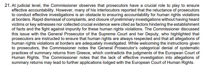 Ο Επίτροπος συζήτησε το ζήτημα αυτό με την Εισαγγελέα του Αρείου Πάγου, Γεωργία Αδειλίνη και την Αναπληρώτριά της, οι οποίες επεσήμαναν ότι οι εισαγγελείς έχουν σαφείς εντολές να διασφαλίζουν τον σεβασμό των ανθρωπίνων δικαιωμάτων και ότι όλες οι καταγγελίες για παραβιάσεις στα σύνορα πρέπει να ερευνώνται επαρκώς. Αν και ο Επίτροπος χαιρετίζει τις οδηγίες προς τους εισαγγελείς, σημειώνει την κατηγορηματική άρνηση της Εισαγγελέως του Αρείου Πάγου σχετικά με την ύπαρξη συστηματικών πρακτικών επαναπροωθήσεων από την Ελλάδα, η οποία έρχεται σε αντίθεση με τις αποφάσεις του Ευρωπαϊκού Δικαστηρίου Ανθρωπίνων Δικαιωμάτων. Ο Επίτροπος τονίζει ότι η έλλειψη αποτελεσματικής διερεύνησης τέτοιων καταγγελιών ενδέχεται να οδηγήσει σε νέες προσφυγές στο Ευρωπαϊκό Δικαστήριο Ανθρωπίνων Δικαιωμάτων.