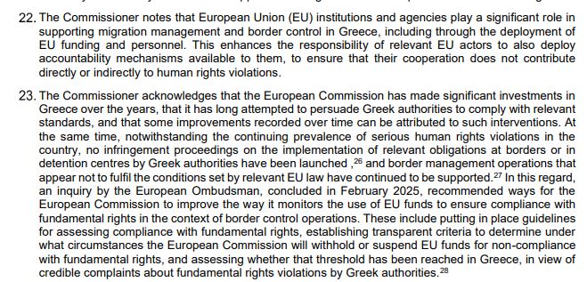 Ο Επίτροπος σημειώνει ότι οι θεσμοί και οι οργανισμοί της Ευρωπαϊκής Ένωσης (ΕΕ) διαδραματίζουν σημαντικό ρόλο στην υποστήριξη της διαχείρισης της μετανάστευσης και του ελέγχου των συνόρων στην Ελλάδα, συμπεριλαμβανομένης της διάθεσης χρηματοδότησης και προσωπικού της ΕΕ. Αυτό αυξάνει την ευθύνη των σχετικών ευρωπαϊκών φορέων να ενεργοποιούν τους διαθέσιμους μηχανισμούς λογοδοσίας, προκειμένου να διασφαλιστεί ότι η συνεργασία τους δεν συμβάλλει άμεσα ή έμμεσα σε παραβιάσεις ανθρωπίνων δικαιωμάτων.