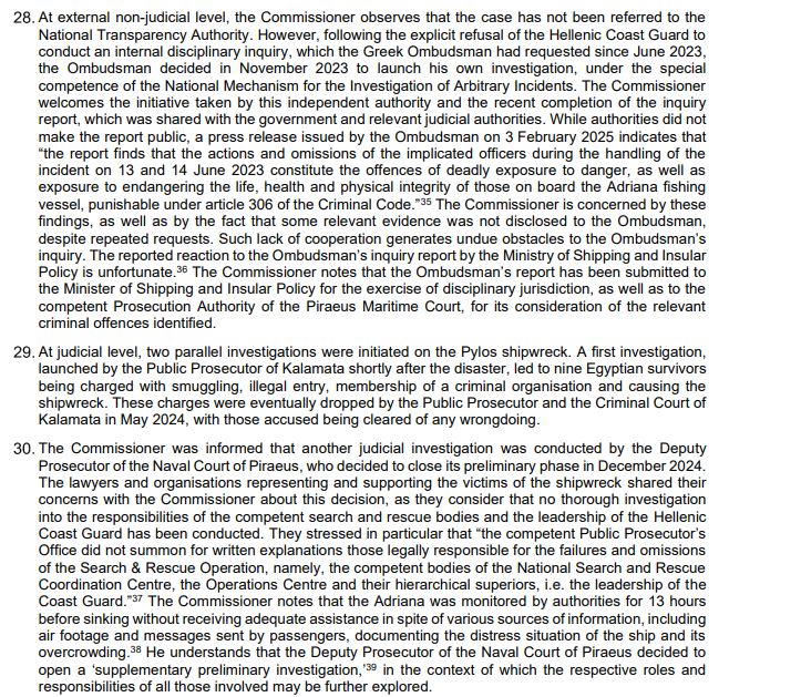 Ο Επίτροπος σημειώνει ότι το πλοίο Adriana παρακολουθείτο από τις αρχές για 13 ώρες πριν από τη βύθισή του, χωρίς να του παρασχεθεί επαρκής βοήθεια, παρά τις πληροφορίες που υπήρχαν από διάφορες πηγές, όπως αεροφωτογραφίες και μηνύματα από επιβάτες, τα οποία τεκμηρίωναν την κατάσταση κινδύνου και τον υπερπληθυσμό του σκάφους. Έχει ενημερωθεί ότι ο Αντεισαγγελέας του Ναυτοδικείου Πειραιά αποφάσισε να ανοίξει ‘συμπληρωματική προκαταρκτική εξέταση’, στο πλαίσιο της οποίας ενδέχεται να διερευνηθούν περαιτέρω οι ρόλοι και οι ευθύνες όλων των εμπλεκομένων.