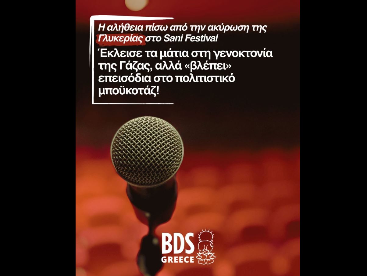 Με αφορμή τα τελευταία δημοσιεύματα για την ακύρωση της συμμετοχής της Γλυκερίας στο Sani Festival, το BDS Greece οφείλει να τοποθετηθεί και να αποκαταστήσει την αλήθεια.