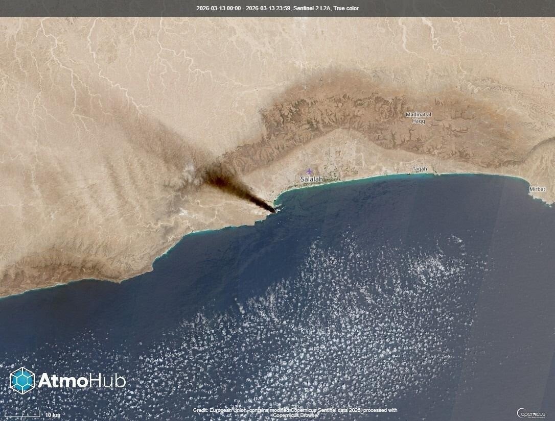 Δορυφορική εικόνα από τη δορυφορική αποστολή Sentinel-2 L2A του προγράμματος «Copernicus», στην οποία απεικονίζεται πλούμιο καπνού από πυραυλικές επιθέσεις σε αποθήκες πετρελαίου του Ομάν στις 13 Μαρτίου 2026. |
