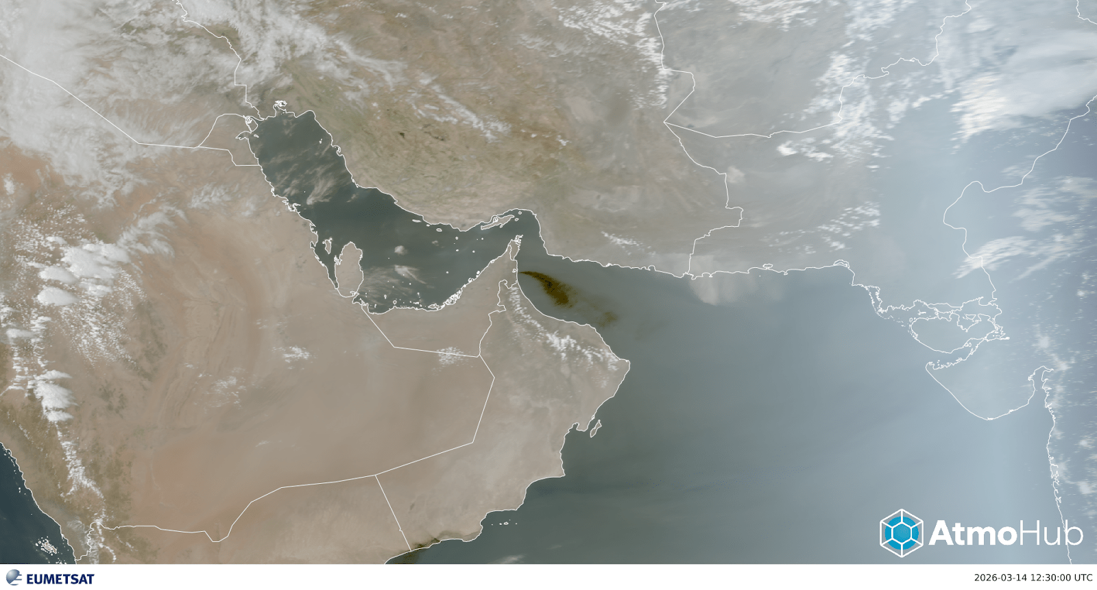 Δορυφορική εικόνα από τον οργανισμό EUMETSAT, στην οποία απεικονίζεται πλούμιο καπνού από πυραυλικές επιθέσεις σε αποθήκες πετρελαίου των Ηνωμένων Αραβικων Εμιράτων στις 14 Μαρτίου 2026. |