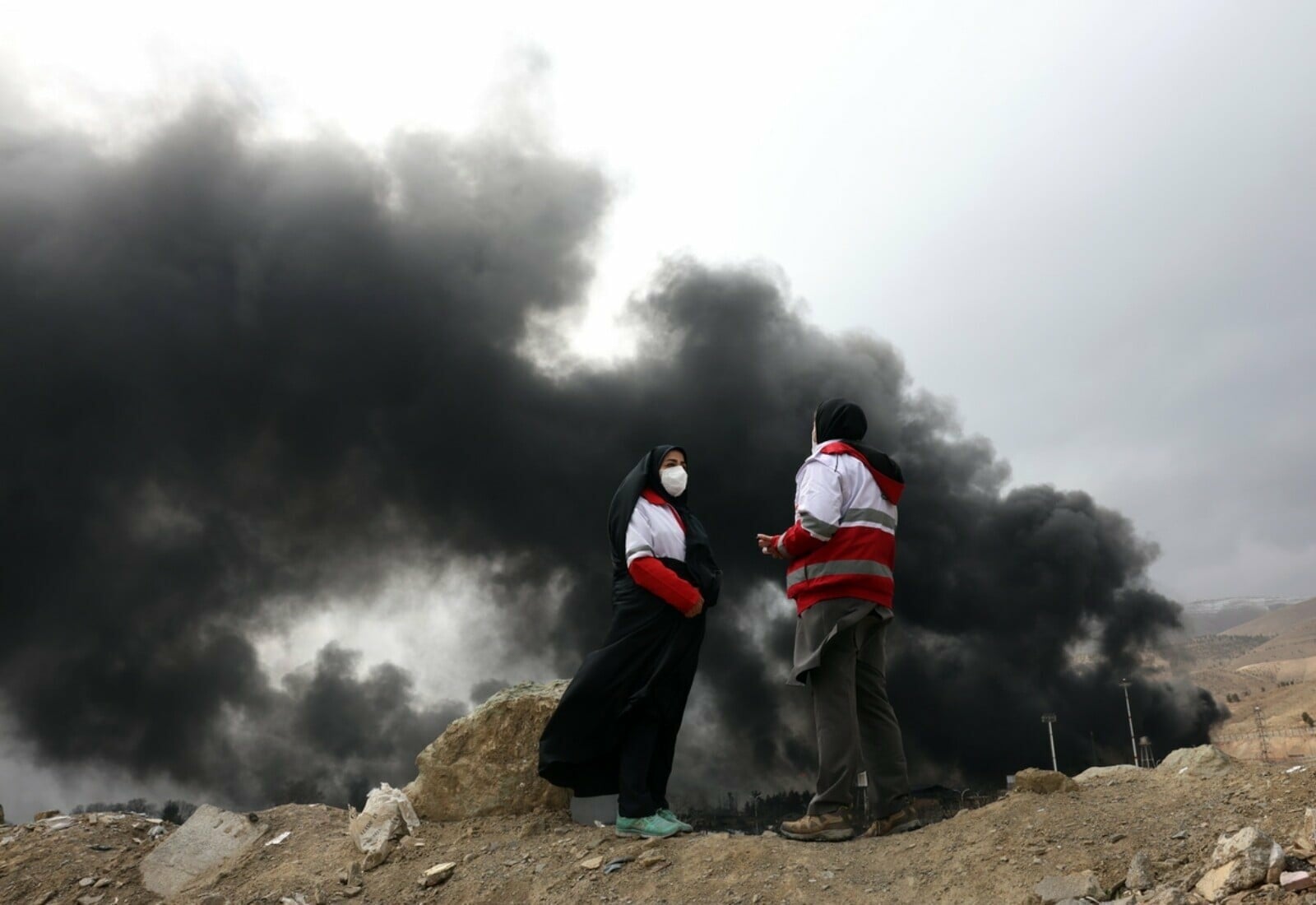 Μέλη της Ερυθράς Ημισελήνου με φόντο τον καπνό από τις επιθέσεις σε αποθήκες πετρελαίου και διυλιστήρια της Τεχεράνης στις 8 Μαρτίου 2026. Φωτ.: EPA |