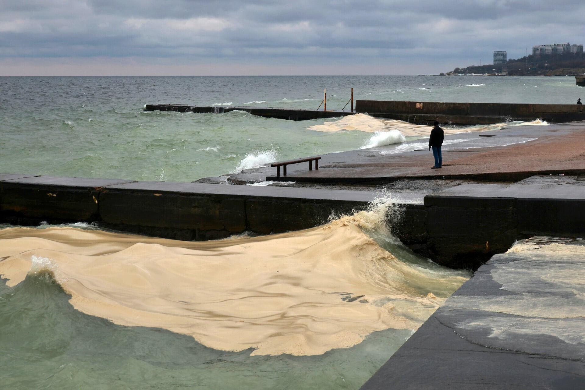 Ένας άνδρας στέκεται δίπλα σε μια πετρελαιοκηλίδα που προκλήθηκε από διαρροή ηλιέλαιου λόγω των ρωσικών επιθέσεων κατά των λιμενικών υποδομών στη Μαύρη Θάλασσα, στην Οδησσό της Ουκρανίας, στις 24 Δεκεμβρίου 2025. Φωτ.: Getty Images/ Ideal Image |